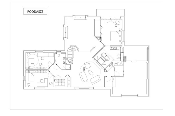 - duży hol stanowiący przestrzeń życiową na poddaszu, aneks kuchenny w bezpośrednim sąsiedztwie,