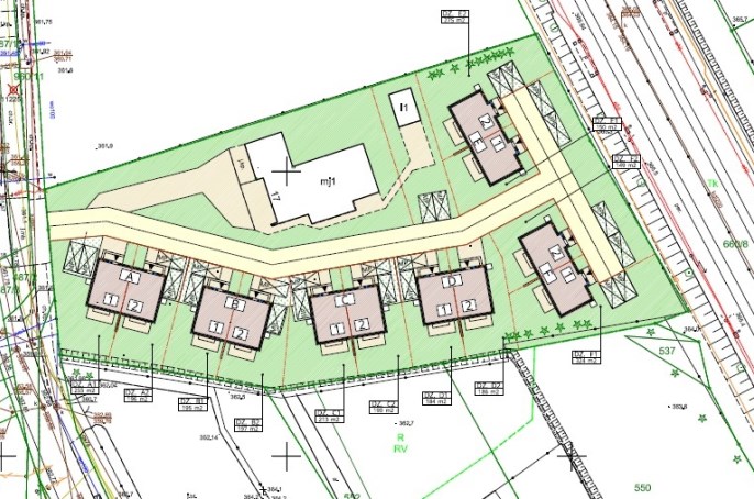 - Teren poszczególnych budynków ogrodzony z trzech stron, (bez ogrodzenia od strony frontowej budynków, bez bramki oraz bramy wjazdowej) – ogrodzenie istniejące lub nowe metalowe siatkowe bez podmurówki.