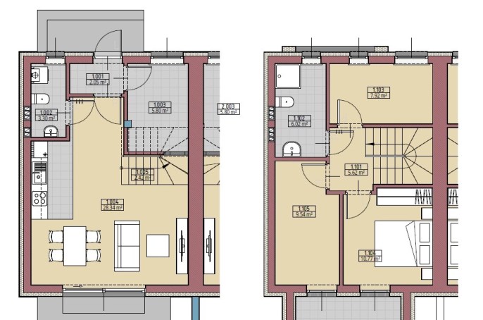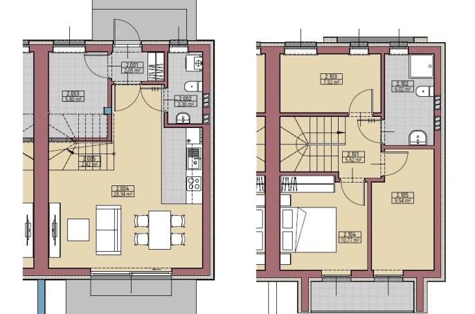 Projektowany budynek składa się z dwóch niezależnych lokali mieszkalnych. W skład każdego wchodzi część dzienna na parterze (salon z kuchnią z wyjściem na taras, wiatrołap, pom. gospodarze, łazienka) oraz część sypialniana na piętrze (trzy pokoje sypialniane – dwa z wyjściem na balkon oraz łazienka).