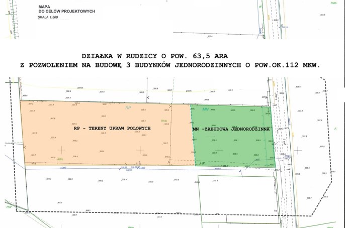 Działka objęta jest Miejscowym Planem Zagospodarowania Przestrzennego, według którego około 20 arów stanowi część budowlaną oznaczoną symbolem MN - zabudowa jednorodzinna, a pozostała część działki ok. 44 ary - stanowi część bez możliwości zabudowy oraz część oznaczoną symbolem RP – tereny upraw polowych. Rolna część działki jest zagospodarowana: altanka, drzewa owocowe, krzewy – działka sprzedawana jest w całości.