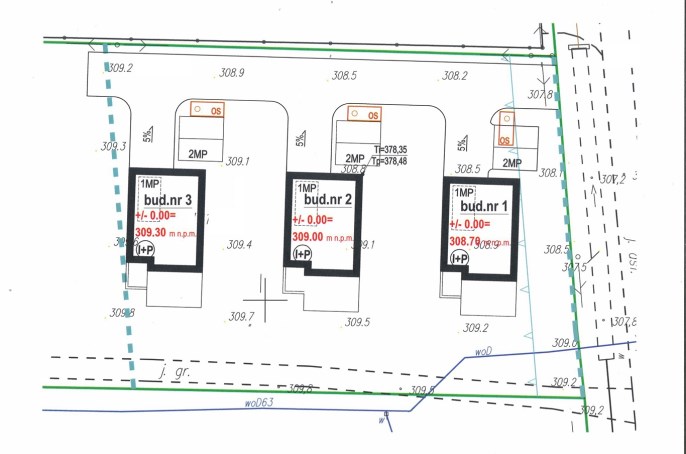 Działka posiada aktualne pozwolenie z rozpoczętą budową trzech budynków mieszkalnych jednorodzinnych - 3 budynki jednorodzinne o pow. użytkowej ok. 112 mkw. z wbudowanym garażem jednostanowiskowym o pow. 18,9 mkw., według nowoczesnego projektu MELON pracowni StudioKrajobrazy.pl